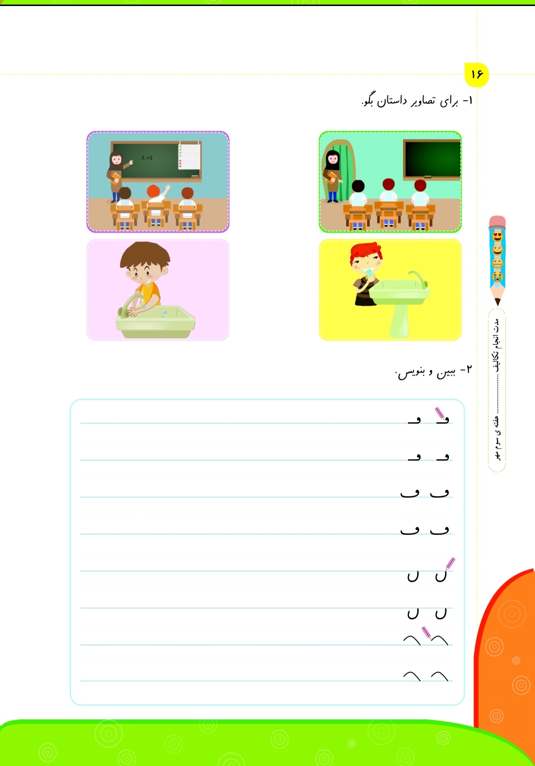 – با تمرینهای ترسیم و تکمیل شکل ها، همزمان با نوشتن، “مهارتهای حرکتی و دقت ” او را پرورش میدهیم.