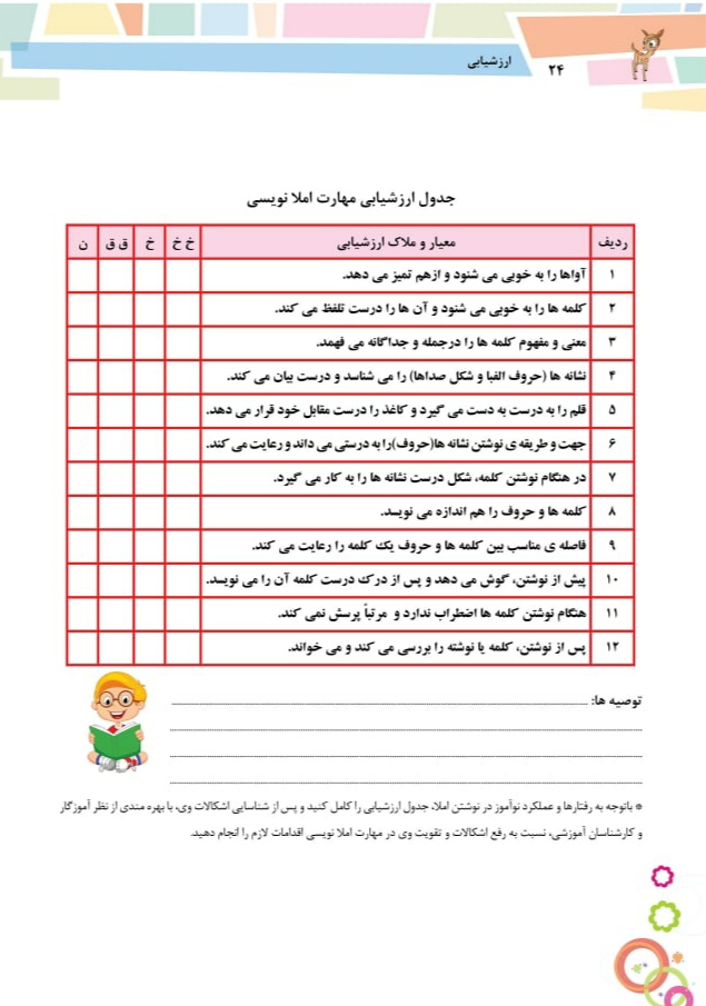- جدول ارزشیابی املا و راهکار های آموزشی برای کاهش اشکالات املایی